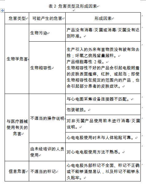 根據YY/T 0316—2016《醫療器械 風險管理對醫療器械的應用》附錄E對“一次性使用心電電極”已知或可預見的風險進行判定,產品在進行風險分析時至少應包括以下的主要危害,企業還應根據自身產品特點確定其他危害。針對產品的各項風險,企業應采取應對措施,確保風險降到可接受的程度。