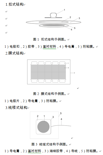 本指導原則的適用范圍為《醫療器械分類目錄》(國藥監械〔2002〕302號)中第Ⅱ類一次性使用心電電極產品,分類代號為6821。一次性使用心電電極系統是心電圖采集設備附件,由傳感元件和電解質組成,帶或不帶連接導線,適用于心電信號測量和監測。電極由基襯材料、導電膏、電極扣等組成。基襯材料采用透氣紙、水刺布、無紡布、發泡紙、棉布或PE等加涂醫用壓敏膠制成,形狀可分為圓形、橢圓形、方形等,尺寸可分為若干規格。