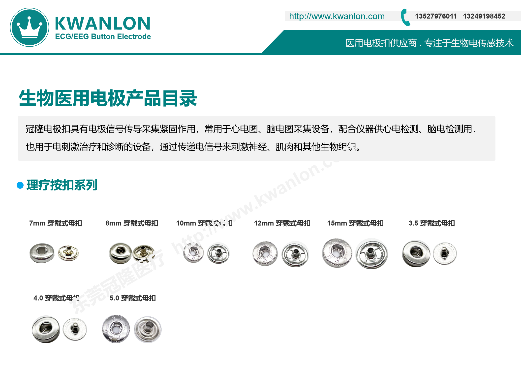 每一款電極扣母扣都有相對(duì)應(yīng)的公扣、底扣(ABS鍍氯化銀扣),規(guī)格尺寸從2.3至5.0,公扣規(guī)格2.2至4.7;每一款電極扣母扣都有相對(duì)應(yīng)的公扣、底扣(ABS鍍氯化銀扣),規(guī)格尺寸從2.3至5.0,公扣規(guī)格2.2至4.7。冠隆電極扣規(guī)格款式在國(guó)內(nèi)同類(lèi)廠家算是比較齊全的,歡迎各界前來(lái)咨詢(xún)!